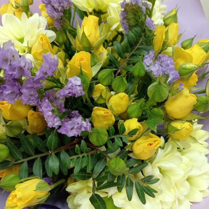 Хризантема кустовая – 3 шт.Роза кустовая – 9 шт.Лимониум – 2 шт.Зелень – 3 шт.Упаковка – 1 шт.