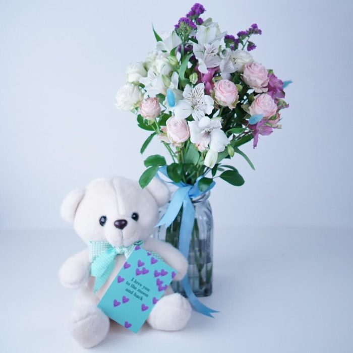 Альстромерии, Гвоздики, Кустовые розы, Лизиантусы, Розы, Хризантемы