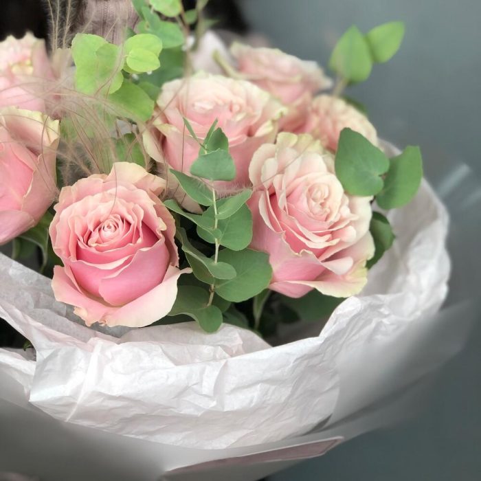 Букет роз « Пинк мондиаль» и эвкалипта