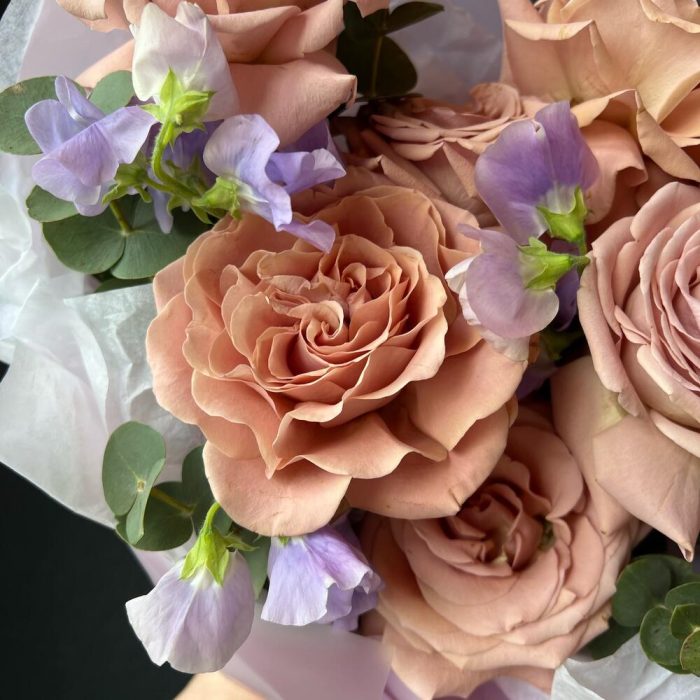 Букет с пионовидной розой, латирус и эвкалипт «Сиреневый туман»