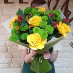 Букет в желто-зеленых тонах для тех, кто любит все естественное. Букет обернут натуральным крафтом в таких же тонах. Все вместо симфолизирует близость к природе. К подарку обычно прикладывается наша карточка с красиво напечатанным текстом вашего послания. К букетам обычно прилагается рекомендация по уходу и объяснением причин. При доставке температура в машине курьера контролируется нами в зависимости от сезона.