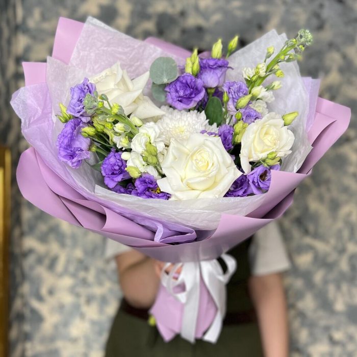 роза пионовидная плая бланка – 3 шт.Хризантема кустовая – 1 шт.Маттиола – 2 шт.эустома махровая – 3 шт.Эвкалипт – 2 шт.Тишью белое – 2 шт.Пленка матовая – 5 шт.Лента атласная – 2 шт.