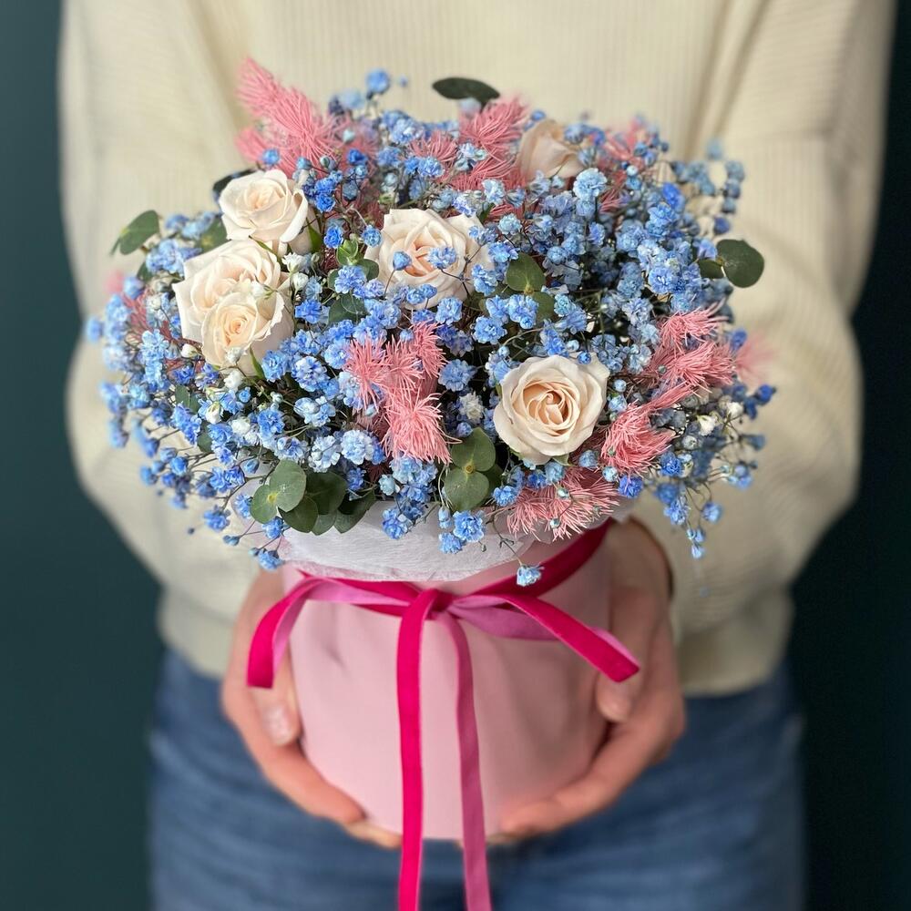 Цветочная композиция в шляпной коробке с голубой гипсофилой “Майолика”