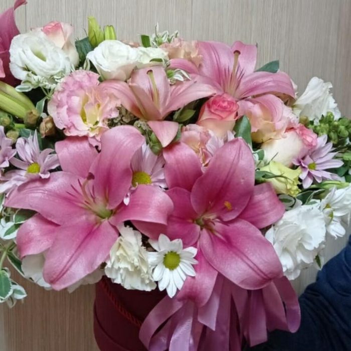 Лилия розовая – 1 шт. Роза Джумилия – 3 шт. Львиный зев розовый – 4 шт. Лизиантус Алиса белый – 3 шт. Хризантема кустовая – 1 шт.