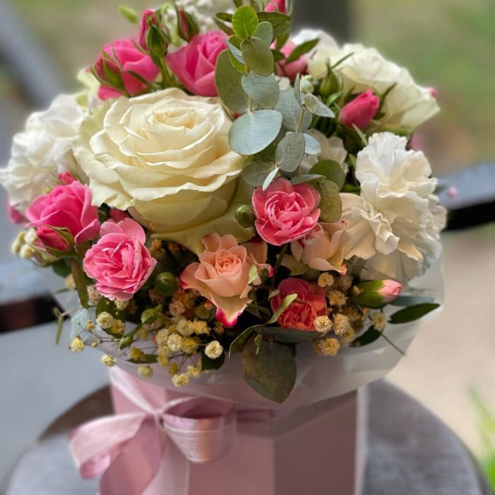 Альстромерии, Гвоздики, Кустовые розы, Лизиантусы, Розы, Хризантемы