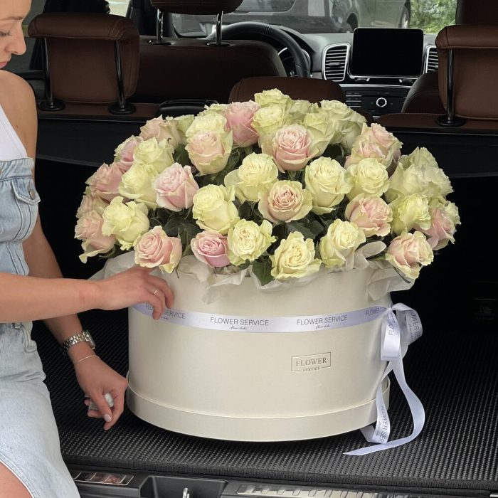 Оазис – 8 шт. Коробка – 1 шт. Оформление – 1 шт. роза белая и розовая – 75 шт.