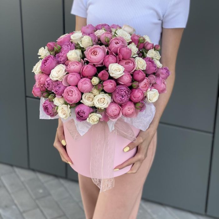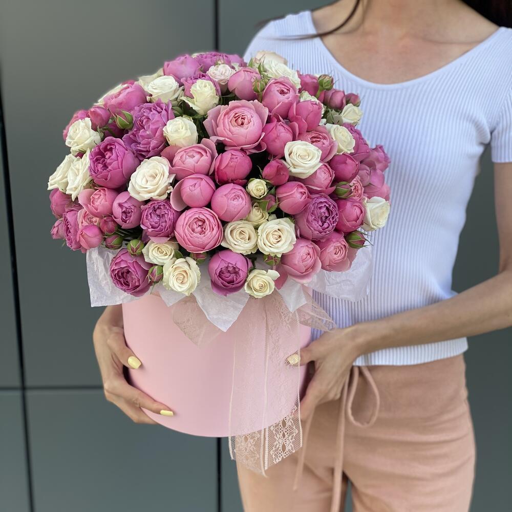 Оазис – 2 шт. Коробка – 1 шт. Кустовая пионовидная роза – 21 шт.