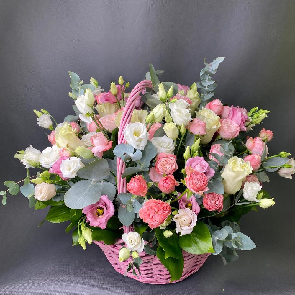 Роза Эквадор – 7 шт.Роза кустовая пионовидная – 7 шт.Лизиантус – 7 шт.Рускус – 10 шт.эвкалипт ветка – 2 шт.Оазис флористический – 2 шт.Корзина большая – 1 шт.