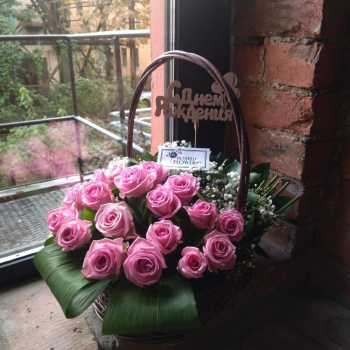 Корзина с 19 розовыми розами и гипсофилой “Самой яркой”