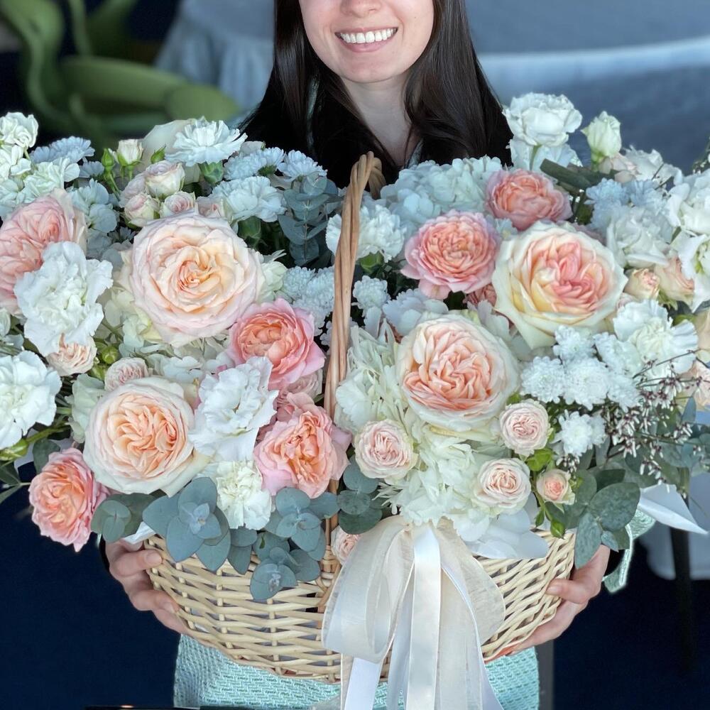 Гортензия – 3 шт.Пионовидная роза – 5 шт.Хризантема кустовая – 4 шт.Кустовая роза – 4 шт.Лизиантус Алиса белый – 5 шт.Маттиола белая – 3 шт.Эвкалипт – 1 шт.
