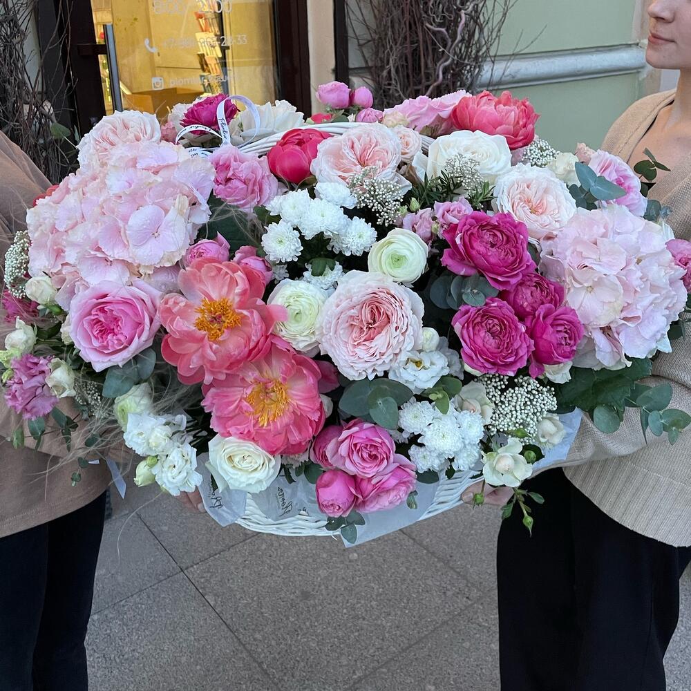 Гортензия – 3 шт.Пион – 5 шт.джульетта церайз – 5 шт.роза цумуги – 6 шт.Махровый лизиантус – 5 шт.Стифа – 5 шт.Озотамнус – 5 шт.роза кустовая сильва пинк – 5 шт.Ранункулюс – 5 шт.роза пионовидная white o’hara – 5 шт.Хризантема Сантини – 5 шт.Роза кустовая – 4 шт.Эвкалипт – 15 шт.Фисташка пучок – 1 шт.Корзина плетеная – 1 шт.