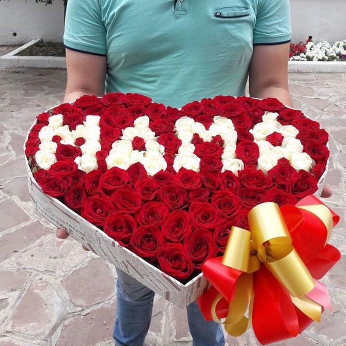 Лента – 2 шт. Коробка сердце – 1 шт. Роза одноголовая местная 50 см – 135 шт.