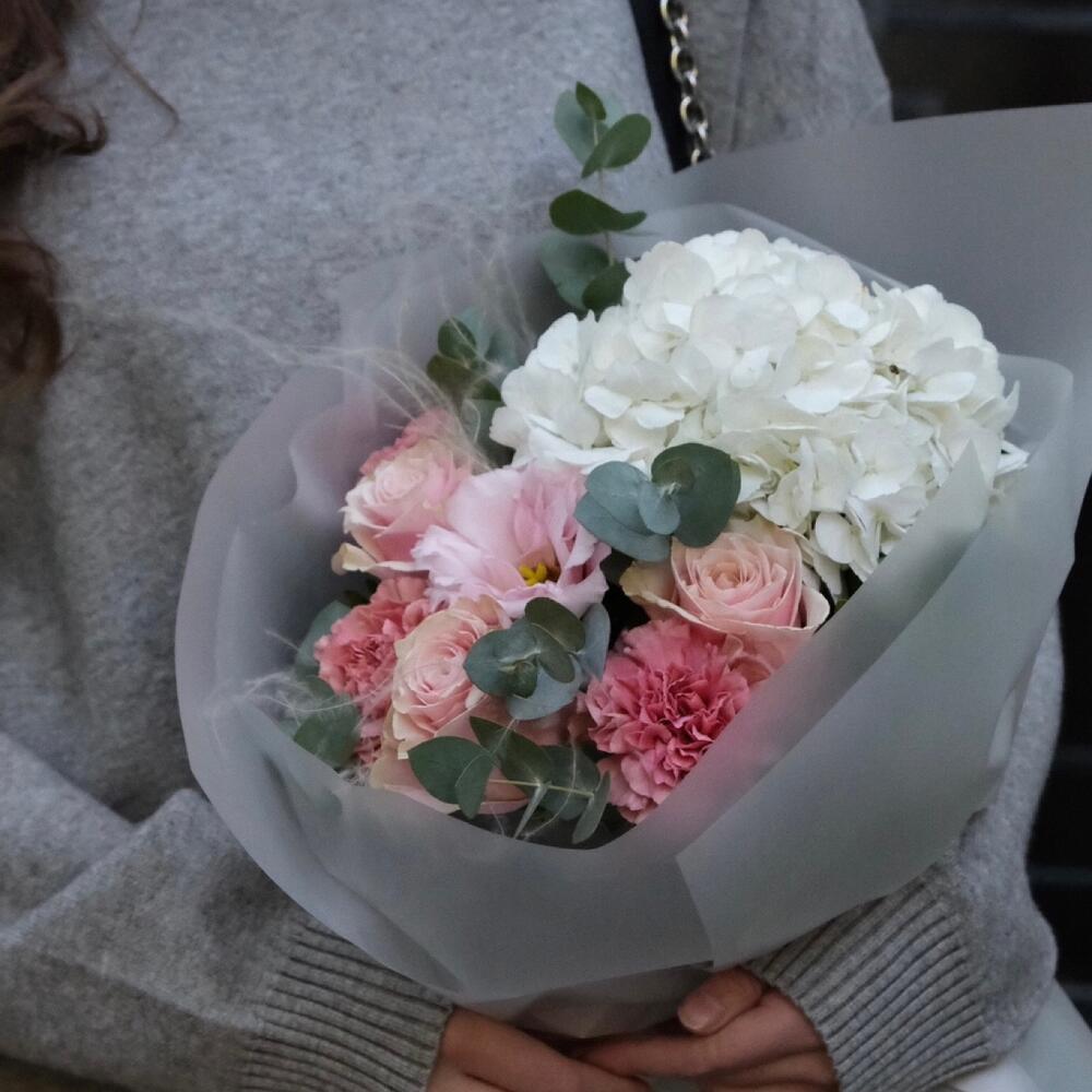 Альстромерии, Гортензии, Кустовые розы, Лизиантусы, Розы, Хризантемы