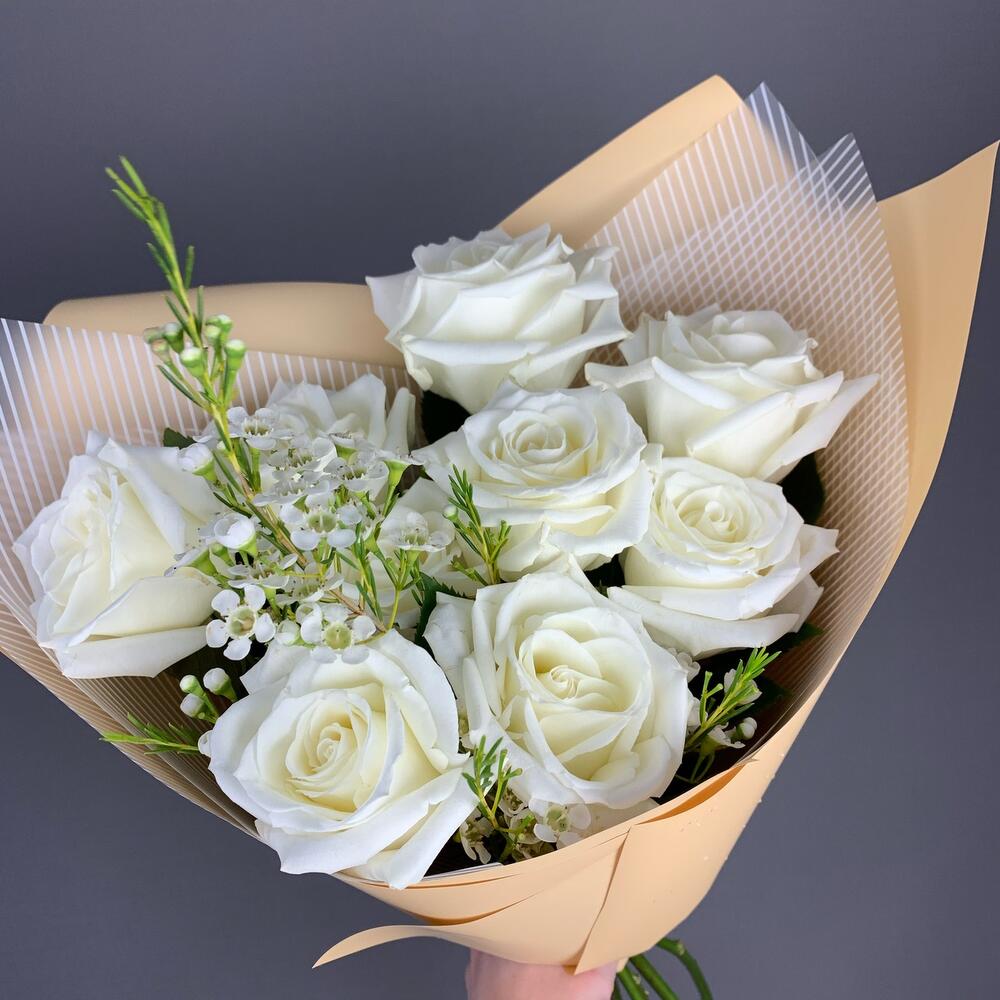 Роза белая – 9 шт.Ваксфлауэр – 1 шт.Упаковка дизайнерская – 1 шт.