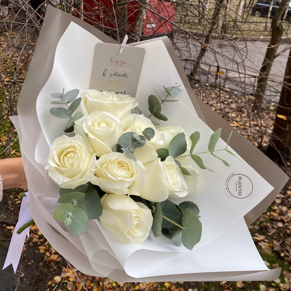 Атласная лента – 1 шт.белая матовая пленка – 2 шт.ветка эвкалипта – 5 шт.proud роза белая – 9 шт.корейская упаковка белая – 2 шт.