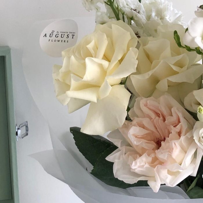 Дельфиниум – 1 шт.ферзия – 2 шт.Роза пионовидная – 2 шт.Роза сортовая – 3 шт.Лизиантус – 1 шт.Эвкалипт – 1 шт.Упаковка дизайнерская – 1 шт.