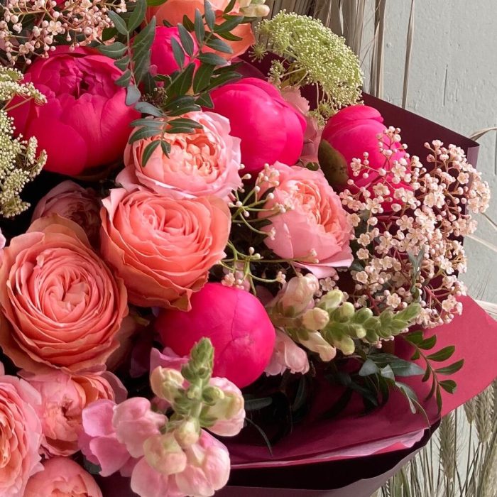 Пион – 9 шт.Роза пионовидная кустовая – 3 шт.Роза пионовидная – 3 шт.Львиный зев – 4 шт.зонтики – 3 шт.фатиния – 2 шт.Фисташка – 3 шт.Упаковка дизайнерская – 1 шт.Лента атласная – 1 шт.