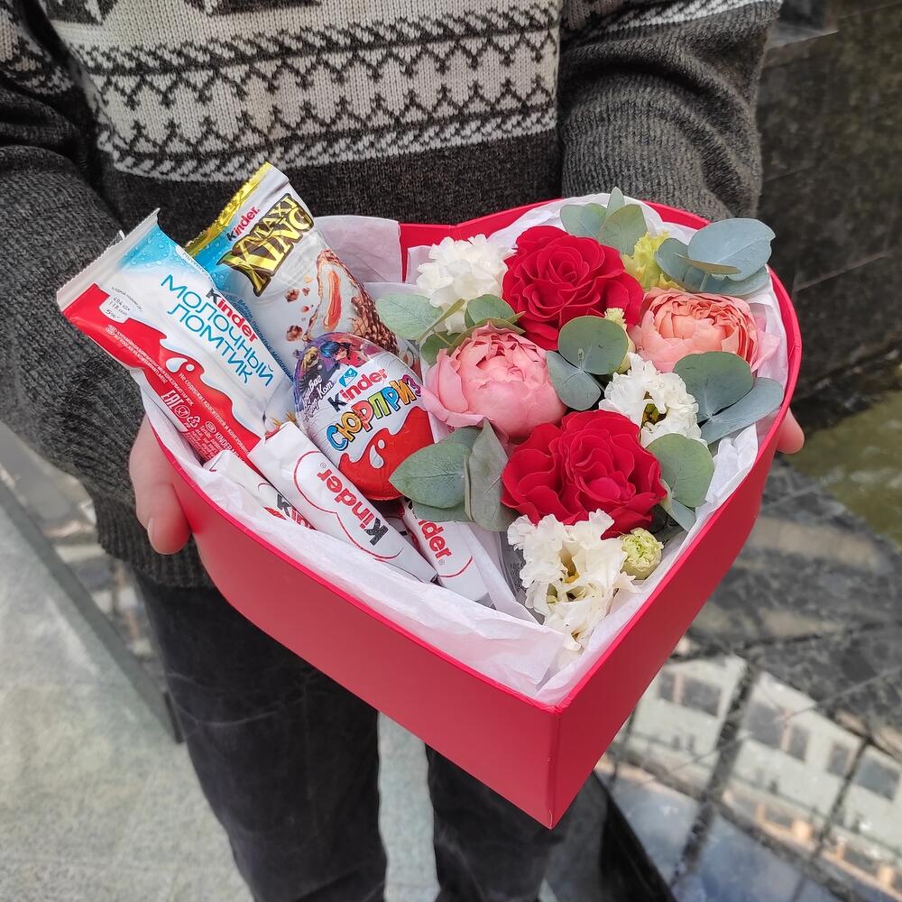 “Сладкое сердце ” – цветочная композиция с сладостями в коробке “Сердце”