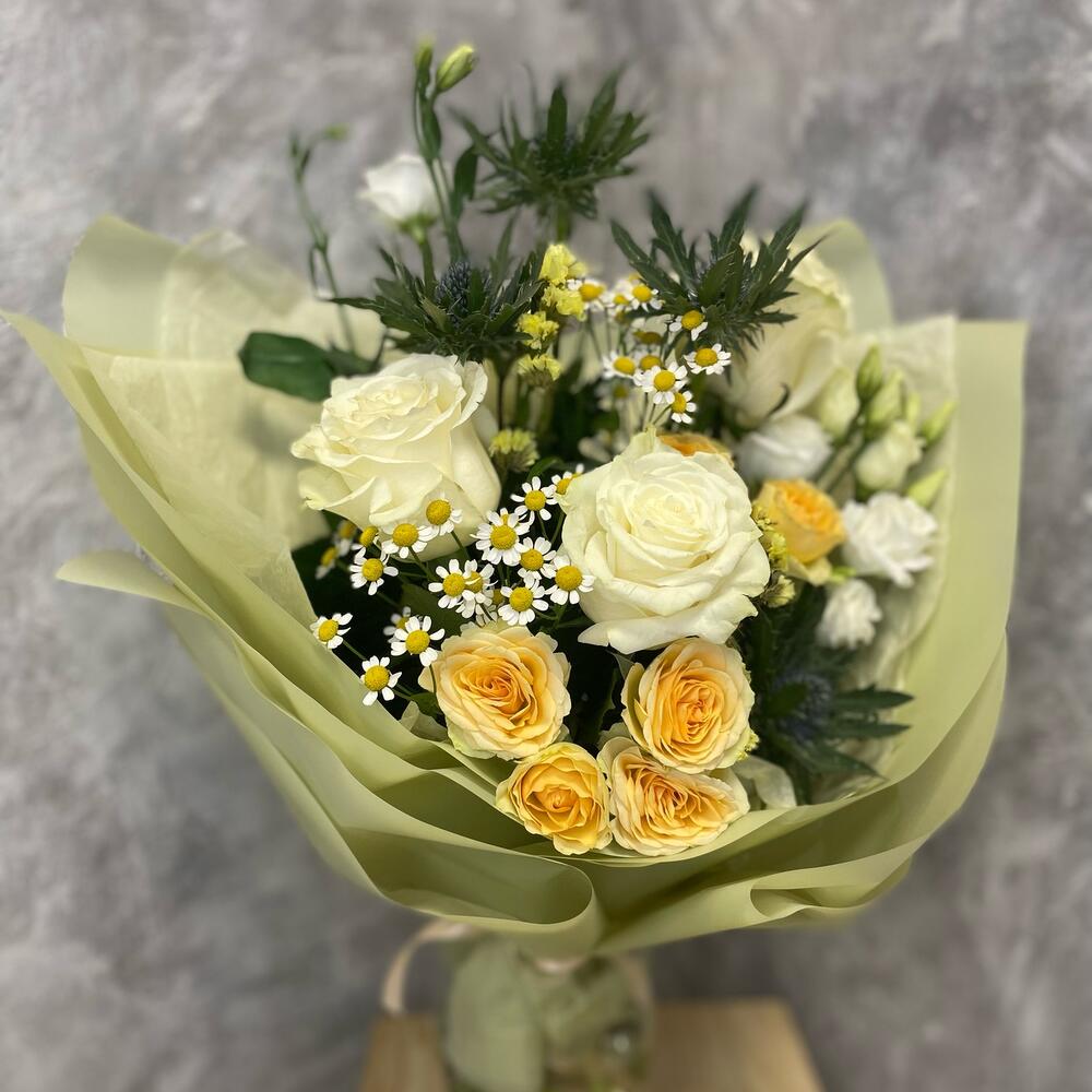 Эквадор роза – 3 шт.Кустовая роза – 2 шт.Танацетум – 2 шт.Лизиантус – 2 шт.Статица – 1 шт.Эрингиум – 4 шт.Упаковка – 1 шт.Лента атласная – 1 шт.