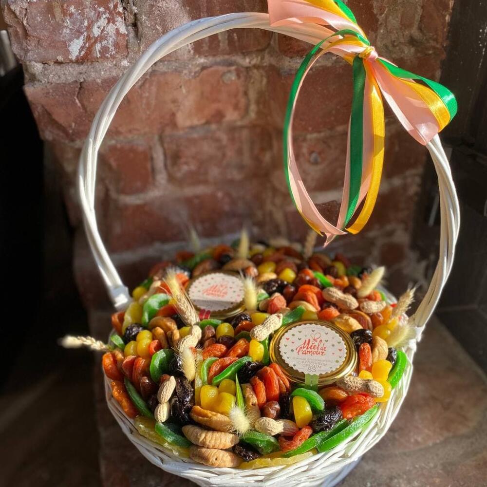 Корзина с орехами, сухофруктами и мёдом “Первые ростки”