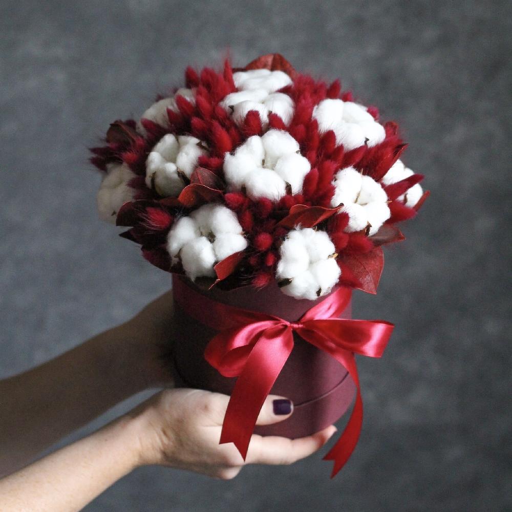 Лагурус (сухоцвет) – 77 шт.Хлопок натуральный – 7 шт.Декор – 2 шт.Коробка шляпная – 1 шт.Лента атласная – 1 шт.Оазис флористический – 1 шт.