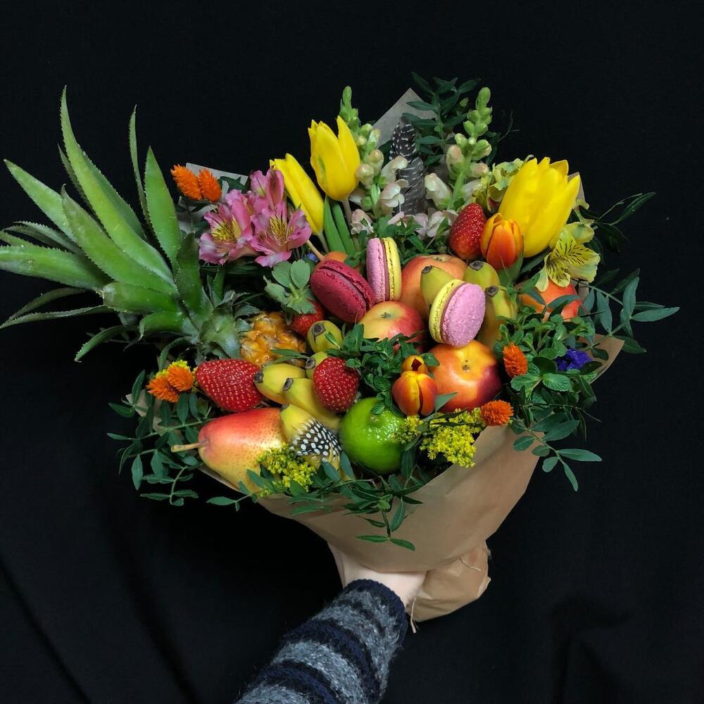 мини бананы – 8 шт.Мини ананас – 1 шт.груши – 4 шт.яблоки – 5 шт.Тюльпан – 3 шт.альстромерия и или статица – 5 шт.Клубника – 5 шт.макарон (пирожное) – 3 шт.фисташка зелень – 3 шт.нектарины или слива – 4 шт.Лагурус – 5 шт.Лайм – 3 шт.