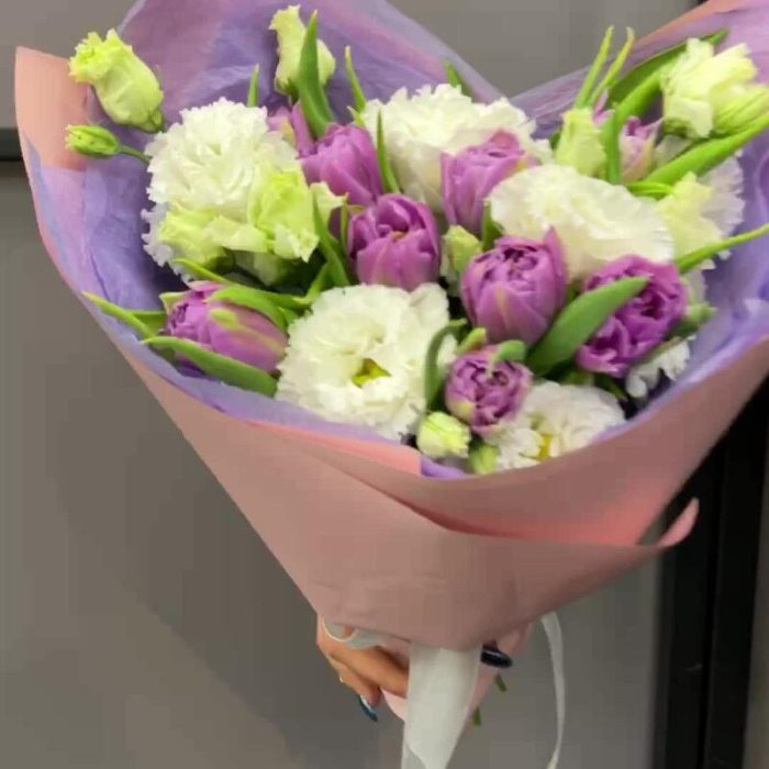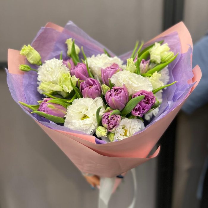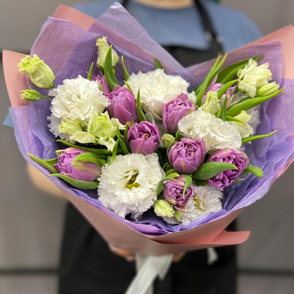 Тюльпан пионовидный – 9 шт.эустома махровая – 2 шт.Тишью – 2 шт.Пленка матовая – 2 шт.Лента атласная – 2 шт.